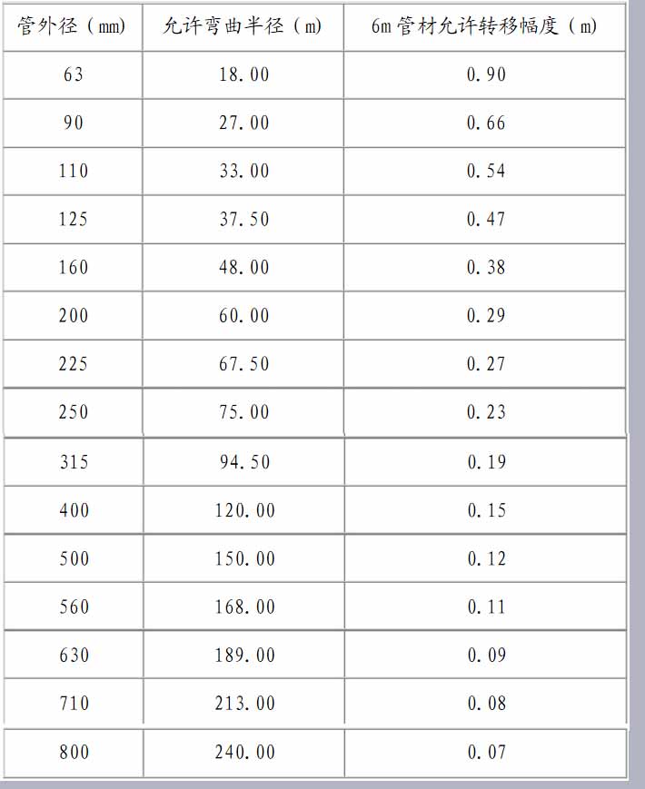- 我们在管道铺设时,由于沟槽、地形的因素,有时会出现小型障碍物,必须借助管材的弯曲和接头的角度进行转弯,一般来讲,借助管材转弯的曲率半径不得小于管材直径的300倍,必要时还应设水泥镇墩加以固定;借助接头转弯每个接头角度大宜大于1°。下面是各种管材的曲率半径及幅度表,仅供参考: